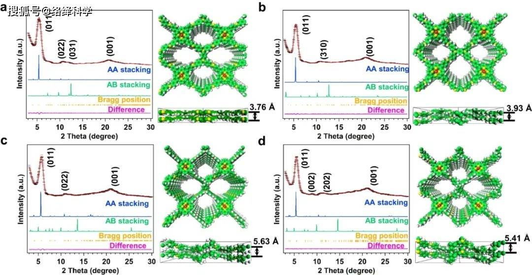 CoTAPP-PATA-COF 的 PXRD 衍射结果显示出位于 5.15,11.02,12.23 和 21.84° 的特征峰,对应于(011),(022),(031)和(001)晶面。同时,CoTAPP-PATA-COF 的晶体结构为 AA 堆叠模型,从而为高效传质提供开放通道。