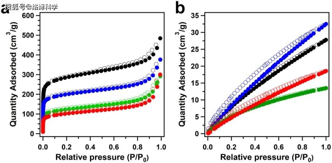 图 3. CoTAPP-PATA-COF(黑色),N+-COF(绿色),NH-COF(蓝色)和 N+-NH-COF(红色)的(a)77 K 温度下的氮吸附脱附曲线,以及(b)273 K 条件下的 CO₂ 吸附曲线