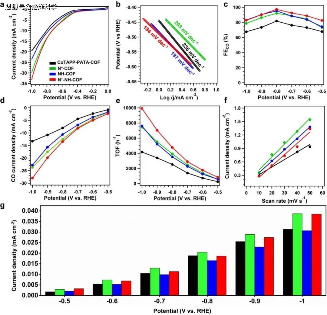 LSV 曲线表明,CoTAPP-PATA-COF 和 NH-COF 的电流密度在相同的电位范围内较为接近。相比之下,N+-COF 和 N+-NH-COF 的电流密度增加,表明离子化骨架可促进电子传输,从而提高电流密度。CoTAPP-PATA-COF,N+-COF,NH-COF 和 N+-NH-COF 在 –1.0 V 电位下的 TOF 值分别为 4166.19,7453.19,7604.63 和 9922.68 h-1。