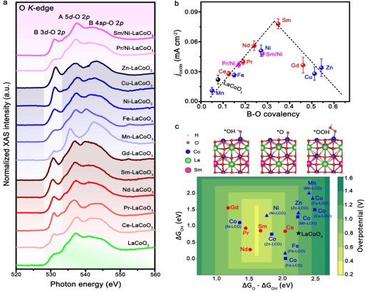 图2.(a)系列钙钛矿材料的氧的XAS-K边曲线;(b)B-O共价键与OER活性的火山图关系;(c)DFT理论计算。